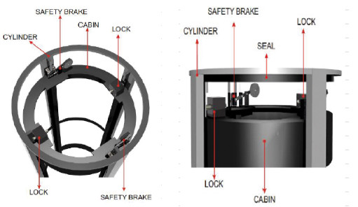 Olası bir kaza/afet/basınç kaybı durumunda, mekanik emniyet kilitleri devreye girer ve paraşüt fren sistemini aktifleştirerek kabinin 5cm mesafe içerisindedurmasını sağlar. Akabinde yolcular güvenle tahliye edilebilinir.